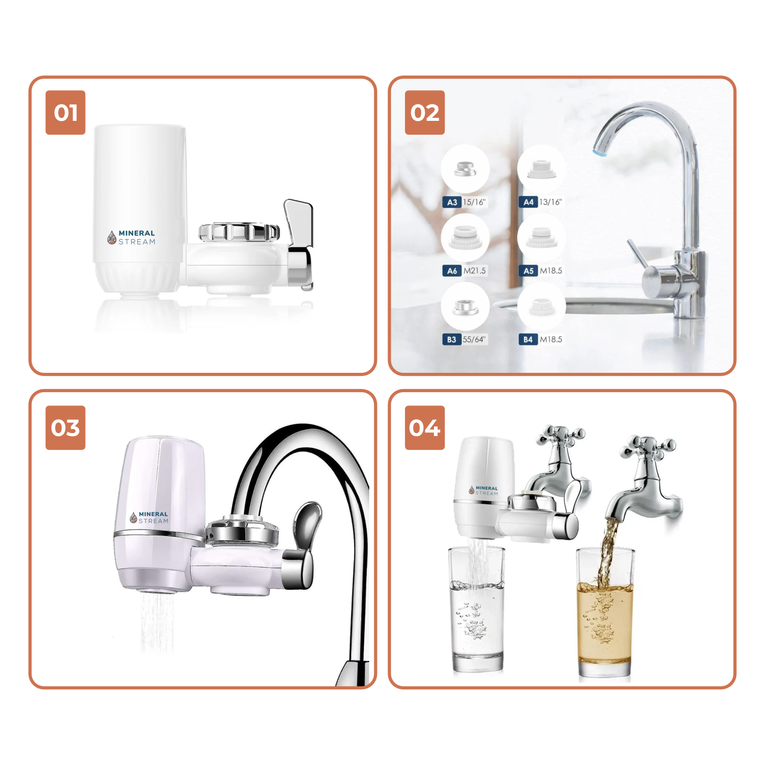 Select the correct adaptor for your faucet size from the 6 included: - A3 (15/16") — A4 (13/16") — A5 (M18.5) — A6 (M21.5) — B3 (55/64") — B4 (M18.5) Remove your faucet's existing aerator and screw on the matching adaptor. - Attach the Filter to Your Faucet