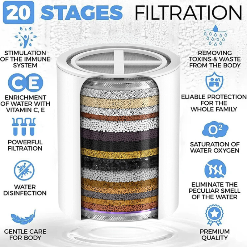 Sistema inovador de filtragem de 20 estágios, composto por pedras minerais iônicas, ABS (acrilonitrila butadieno estireno), algodão PP, vitamina C, KDF 55 e muito mais para amaciar água dura e remover elementos indesejados, como cloro, bactérias, sujeira e ferrugem.